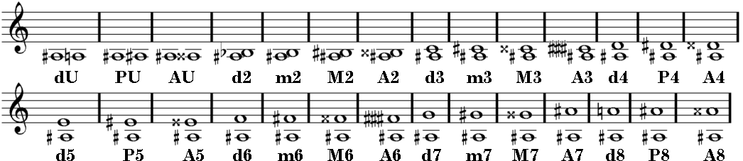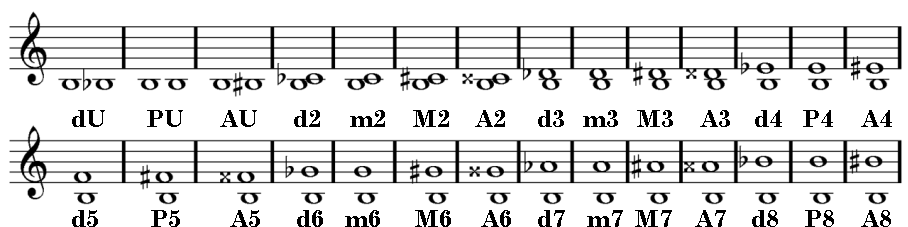 We might use sharps (), flats (), double sharps (), double flats (), triple sharps () and triple flats() to allow us to correctly notate any or all of these intervals, depending on what the first note is. It is important to remember that sharps and flats, double sharps and flats and certainly triple sharps and flats represent different views of the same note, e.g.: