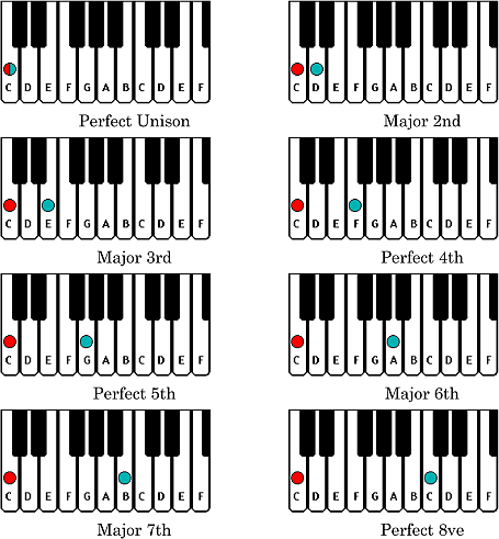 For each of the above intervals here is a keyboard diagram showing the number of semi-tones (half-tones) found in the interval: