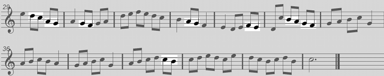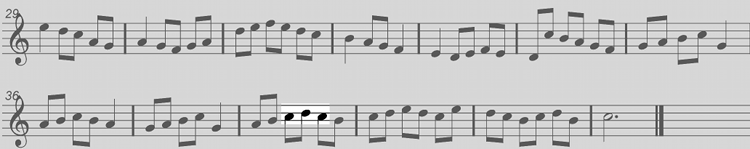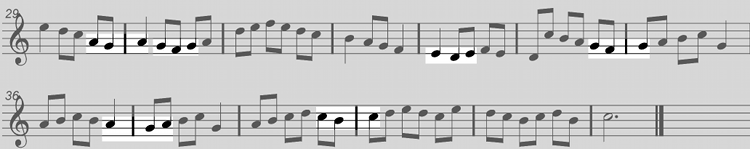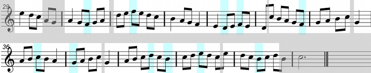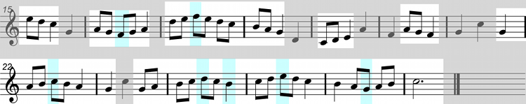 This time we can see passing notes that are on and off the beat. The notes that are shown in duck-egg blue participate in both the downward and upward movement of scale runs, acting as turning points in the melody.